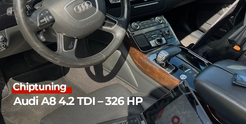 Audi A8 je symbolem precizního německého luxusu. Elegantní design, špičkové technologie, ticho v kabině a výkon, který zvládne všechno od dálniční jízdy po svižné přesuny po Evropě. Pod kapotou verze 4.2 TDI V8 o výkonu 326 HP (240 kW) už v základu pracuje pořádná porce síly, ale tenhle motor má v sobě ještě víc, než udává tovární tabulka – a my jsme ten potenciál odemkli.