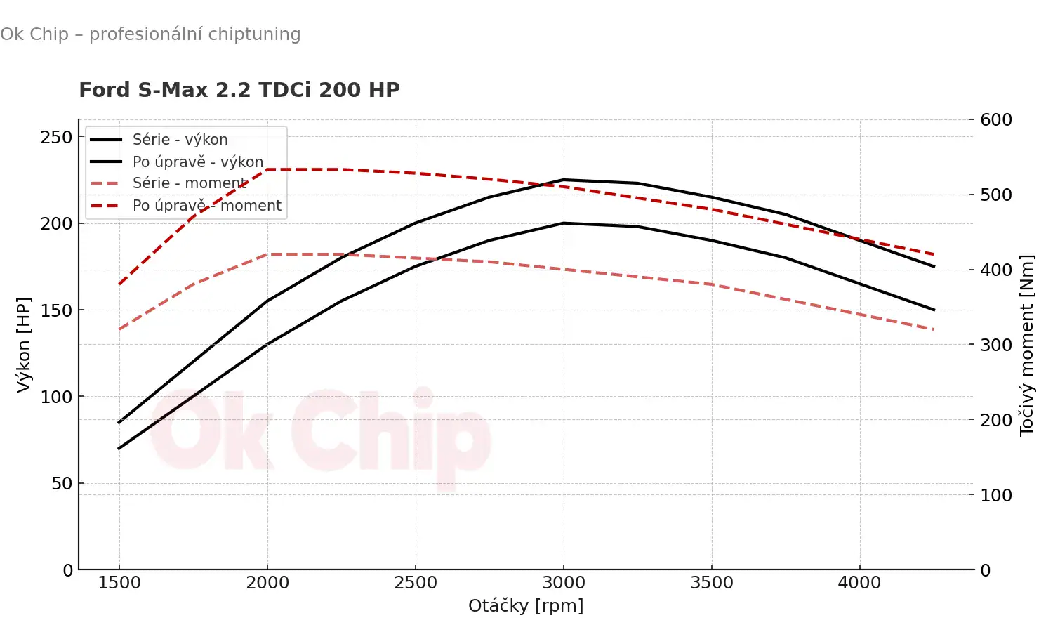 Ford S-MAX je už léta symbolem prostornosti, pohodlí a praktičnosti. Ve verzi s motorem 2.2 TDCi o výkonu 200 HP (147 kW) nabízí i v sériovém stavu velmi solidní dynamiku, která z něj dělá jedno z nejzajímavějších MPV své doby. Přesto má tento robustní čtyřválec Duratorq rezervy, které lze bezpečně využít – a právě o to se postará profesionální chiptuning.