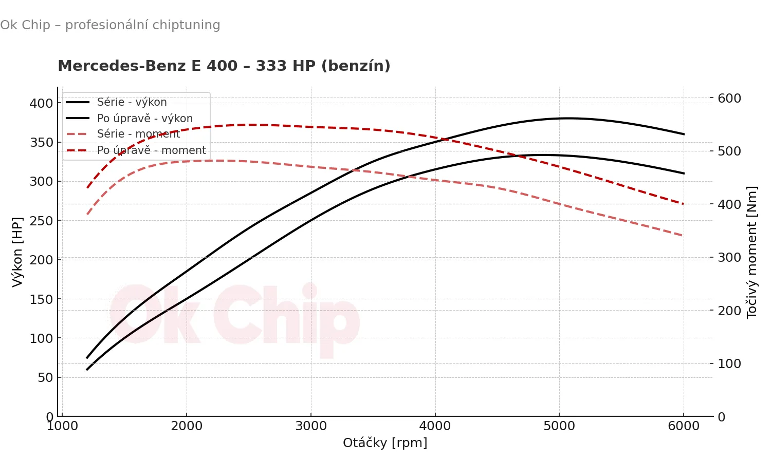 Mercedes-Benz třídy E je pojem. Auto, které spojuje komfort, kultivovanost a technickou preciznost tak, jak to dokáže jen Mercedes. A když se pod kapotou ukrývá motor E 400 – benzinový šestiválec BiTurbo, je základ už sám o sobě velmi silný. Jenže moderní přeplňované motory mají obrovské rezervy… a když se udělá chytrá optimalizace, rozdíl je okamžitě znát.